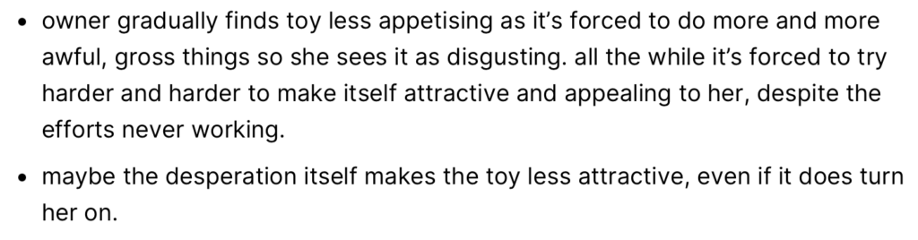 As the toy debases itself and does more disgusting things with men it truly becomes more and more disgusting to me. Using it’s mouth on undesirable men and having them cum in its ass and mouth over and over. Truly becoming a dirty cum dump for men. Every time it meets one of these men, it becomes more tainted by them. By the way they use it. This is all it deserves, to be treated like a piece of meat to fulfil the desires of men. Unreciprocated desires. Unfulfilling and painful for the toy, both physically and mentally.